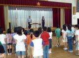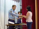 7月2日。6月に行った自転車安全教室で,安全運転の試験に挑戦した5,6年生の子ども達に,自転車安全運転免許証が渡されました。東山署の方から,一人一人の子ども達に素敵な免許証を手渡していただきました。教えていただいたことを守って,安全に自転車に乗ってほしいと思います。