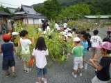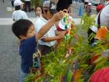 7月3日(金)。毎年,高台寺で行われている七夕祭の笹飾りの短冊に,今年も,全校児童が願い事を書きました。2年生と1年生の子ども達が一緒になって,全校分の飾り付けをしました。サッカー選手になりたいとか,レスキュー隊になりたいといった将来の夢を短冊に書いてお願いする子どももいました。飾り付けの終わった笹飾りの前で,記念写真をとりました。