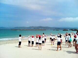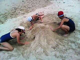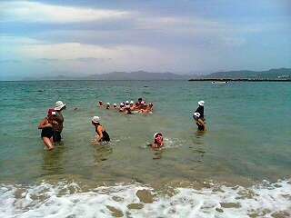 こちらは,めっちゃくちゃいい天気です!でも水が冷たい(>_<)。しかし、みんな楽しんでます!砂で造型にも取り組んでいます!何ができるか楽しみです。(10時)
