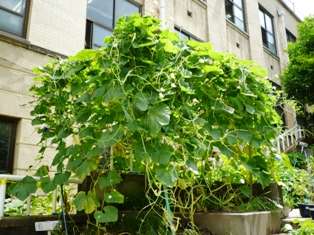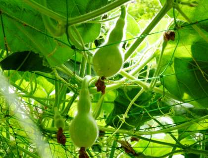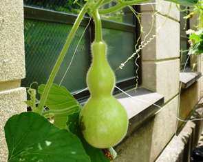 5年生が学年の花壇で育てているヘチマ。先月の中ごろから,毎日,たくさんの白い花を咲かせています。そのヘチマのツルに,ようやく実ができ始めました。今朝,その中の一つが,こんなに大きく育っていました。(7月13日)