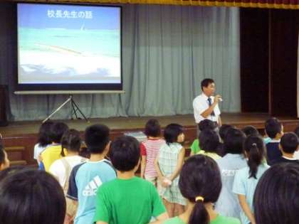 7月22日。今日で学校も終わり,明日から楽しい夏休みに入ります。夏休み前,最終日の今日,全校集会をしました。校長先生の話の後,全校音楽で『なつのおもいで』をみんなで歌いました。最後に,6年生から,みんなにプレゼントを渡してもらいました。