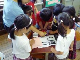 教室に戻ると,夏休みの自由研究や工作などが,たくさん集まっていました。2年生の教室では,早速,みんなでそれを見せあって,「これは,こうするんだよ」と,お互いの作品を前にして,話が弾んでいました。