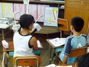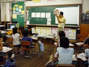 週に1回英語活動の時間があります。今日は,教育委員会の先生に,英語活動の勉強を見ていただきました。英単語ドンジャンゲームや,数を当てる『How many〜』クイズ,そして,かばんの中に隠されているものを当てる『What's this?』クイズなどの活動をしました。緊張したけれども,楽しく活動できました。