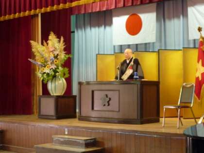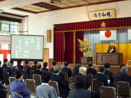 挨拶と祝辞に続いて,記念講演にうつりました。清水寺貫主 森清範氏を講師にお招きし,『梵心』という演題でご講演いただきました。清水校区を代表する清水寺では,長年使われていた梵鐘が,平成になって新しくなりました。その梵鐘の『梵』とは,荘厳なもの,清らかなもの,尊いものなどを意味し,お寺全体が『梵』であるそうです。私たちは,自然や宇宙をはじめ,目に見えない数多くの生命の中で生かされている,仏様をお祈りするということは,そうした尊いものに対して「おおきに」と感謝することであり,そうした心を忘れてはならないことを教えていただきました。