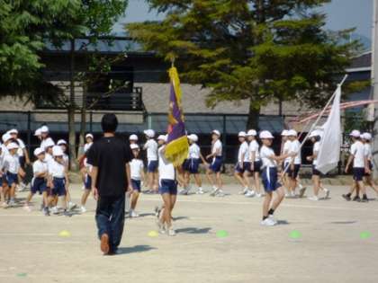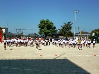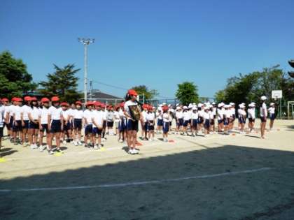17日。今日は,とても爽やかな秋晴れのもとで,全校練習を行いました。開会式の入場行進や退場の仕方,開会式の流れ,そして,全校ダンスの練習をしました。1年生にとっては初めての入場行進でしたが,みんな上手に行進することができました。選手宣誓や優勝旗の返還・授与などの練習も行いました。