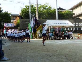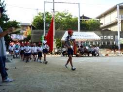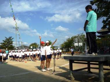 前年度優勝の白組を先頭に,選手が入場行進をしました。開会式では,赤組,白組の応援団長が,力強く選手宣誓を行い,今年の運動会がはじまりました。