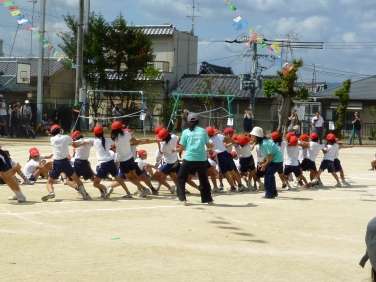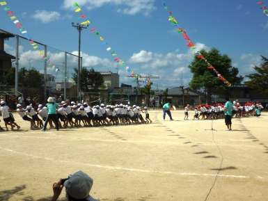 午前中最後の種目,全校綱引き。1年生から6年生まで,力を合わせ,息を合わせて,1本の綱を引き合いました。