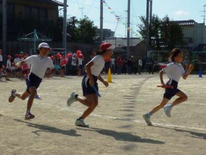 中学年のリレーは,全員によるトラックの周回リレーです。練習の時には,なかなかバトンパスがうまくできない時もありましたが,本番では,だれもバトンを落とすことなく,みんな上手につないでリレーすることができました。