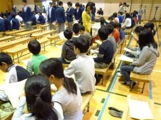 10月14日(水)。洛東中学校の学校祭が,今日から始まりました。今日は,合唱コンクールの日です。6年生が見学に行きました。この見学を「未来に生きる私」という総合的な学習の導入に位置づけ,中学生のお兄さん。お姉さんの立派な様子を見学させてもらいました。どんな合唱を聞かせてもらえるのか,とても楽しみにしながら洛東中学校へ向いました。