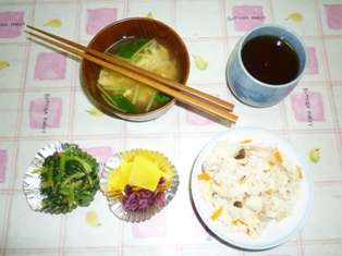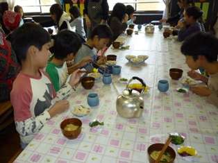 およそ1時間半ほどで,おいしそうなお料理ができあがりました。みんなそろって,「いただきます」をしました。おいしそうなしめじの香りがする炊き込みご飯,ふっくら卵が浮かぶすまし汁,いり胡麻のいい香りがするホウレン草の胡麻あえ,すてきなお昼ご飯をいただきました。今日,教えていただいたお料理を,お家へ帰ってから,また作ってみる子どももいると思います。地域の皆様,本当にお世話になりました。