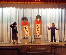 担任の先生からは,「もっと大きな声で」とか「前を見て台詞を言おうね」などのアドバイスが。また,高学年くらいになると,友達同士で,「こうしたらいいよ」とか「もっと〜しようよ」などの言葉を掛け合って練習に取り組んでいます。