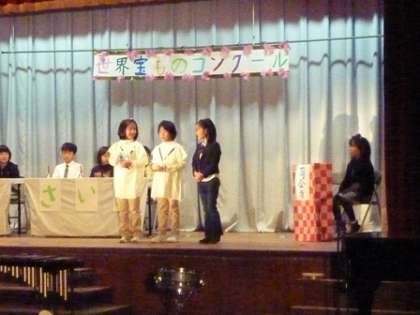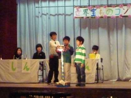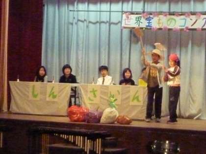 劇 「ほんとうの宝物」をしました。舞台は,世界宝物コンクールの会場です。これこそは世界一だと思う自慢の宝物をもった人たちが,次々に登場します。