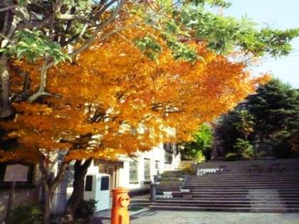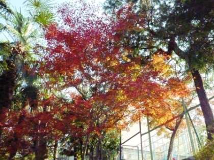 清水寺の紅葉も,今が一番の見ごろですが,本校の校庭にある紅葉も,今が盛りです。赤く染まった紅葉に映える校舎,窓越しに見える黄色い銀杏。とても綺麗です。