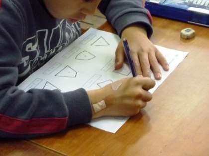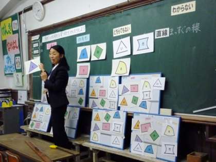 2年生の公開授業では,単元「形を調べよう〜三角形と四角形」の2時間目を行いました。8つの形の中から,三角形と四角形を探し出す学習です。自力解決をした後,隣の人と「これは,三角形だね,これは,四角形だね」「これは,どちらになるのかな?」と相談しながら,示された8つの形をそれぞれ区別していきました。そして,全体で話し合う中で,三角形と四角形の定義に基づいて確かめていきました。