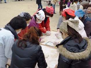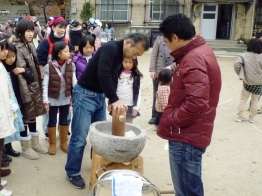 12月13日(日)。比較的穏やかな冬空の下で,年末恒例のおもちつき大会が,少年補導の主催で,清水学区をあげて行われました。少年補導の皆さんをはじめ,PTAの役員さん,地域の皆さんのご協力で,たくさんのお餅がつきあげられました。子ども達だけでなく,地域の方々もたくさん参加され,わきあいあいとした楽しい雰囲気の中で半日を過ごすことができました。