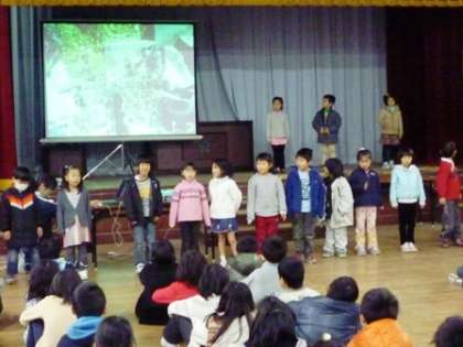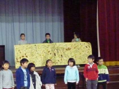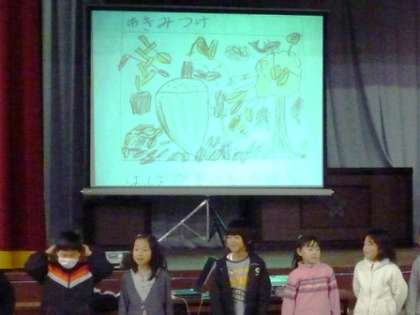 12月15日(木)。今朝の全校集会の時間に,1年生が清水タイムの発表をしました。生活科の時間に,学校の中や周辺,そして,清水山に行って見つけてきたたくさんの”秋”を発表しました。ドングリや綺麗な葉っぱ,そして,学校のプールのところで見つけたカラスウリの実など,みんなで見つけてきたことを紹介しました。中でも,カラスウリの実が学校の中にあったことは,さすがに,ほとんどの人が知らないことで,みんな,とても驚いていました。