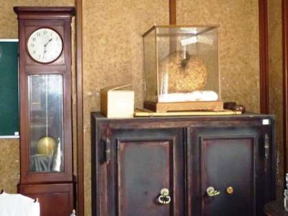 今回は,会議室を紹介します。会議室は,本館2階のとても日当たりがよい部屋です。アーチ型の窓からは,明るい日差しが差し込んできます。部屋の壁には高級な壁張りがはってあり,天井には,玄関同様のしゃれた飾りが施されています。現在は,新しくふれあいサロンができたため,会議で使用することはありませんが,会議室の中央には,とても立派な会議机と椅子が,昔のままに並べられています。部屋の正面には,長年にわたって清水校の時を刻んできた高価な置時計が備えられています。その横には,昔,講堂の壇上に設けられていた御神影が納められていた重厚な金庫が保管されています。また,この部屋には,地域の方々から寄贈された工芸品も保管されています。このように,本校の部屋の中でも,最も格式高く作られた部屋の一つです。