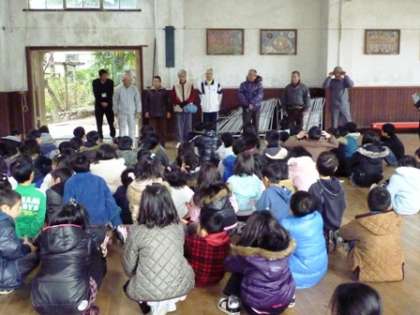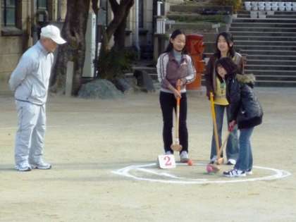 今日,昔遊び大会を行いました。例年,新年最初の日に行っている行事で,子ども達も楽しみにしている行事です。地域の方にも,グランドゴルフやコマ回しなどでお世話になりました。1年生は初めてなので,地域の方に教えていただいたおかげで上手にできるようになり,嬉しかったようです。