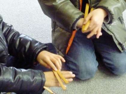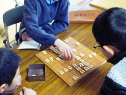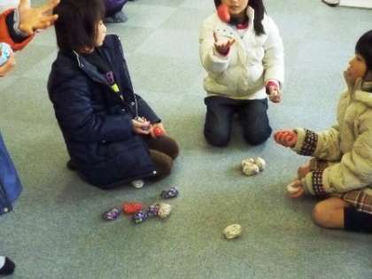 竹返しコーナーでは,手のひらに乗せた竹を上手く裏返せて満足している子どもたちでした。お手玉コーナーでは,いくつかのお手玉を上手に使って投げ上げたり,つかんだりして遊んでいました。将棋コーナーでは,本将棋で対戦する高学年の子どもたちもいれば,駒回りで遊ぶ子ども,駒落としで遊ぶ子どもなど,それぞれに楽しんでいました。