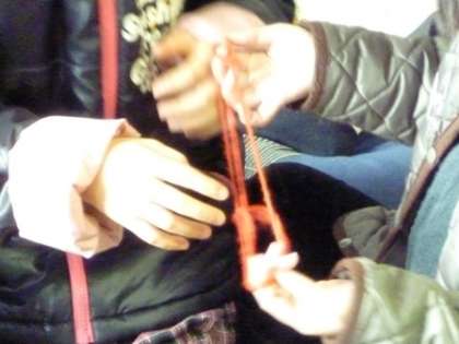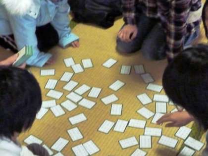 あや取りコーナーでは,先生に教えてもらったり,友達同士で教えあったりしながら,はしごやほうきなどを作ったり,2人組みで紐を取り合ったりして遊んでいました。羽根つきコーナーでは,2人組や4人組で,羽根をついていました。羽根をつく力が入りすぎて羽根が遠くへ飛びすぎたり,空振りをしたりしたりして,なかなか続けて羽根をつくことが難しいようでした。百人一首コーナーでは,本格的にかるた取りをするグループもあれば,坊主めくりで遊ぶグループもありました。中には,上の句と下の句をたくさん覚えている子どももいました。