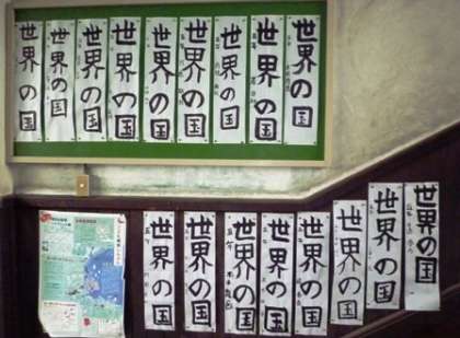 新しい年が明けて,授業が始まりました。5年生では,そのスタートの日に,書初めをしました。みんな一生懸命に画仙紙に「世界の国」という字を書きました。
