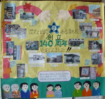 今年も,広報委員の方々に,PTA壁新聞づくりにお世話になりました。今年の新聞のテーマは,「創立140周年」です。清水小学校は,長年にわたって,学校とPTAや地域が連携していろいろな活動に取り組んできました。そうした中から,今年の取組の様子を紹介する紙面になっています。PTAフェスティバルに展示されたこの新聞が,学校に戻ってきたので,今,講堂前のホールに展示しています。本校にお越しの際に,見ていただければありがたいです。