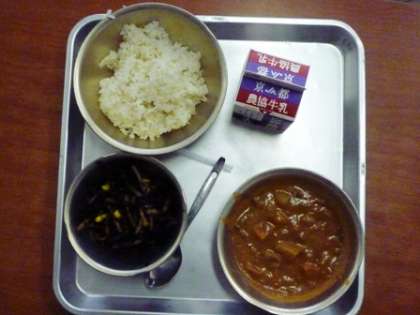 1月21日。給食週間の取組の1つとして,今日は,全校縦割り給食を行いました。普段は自分たちで行っている給食当番の仕事も,今日は縦割りグループの高学年の子ども達が中心になってやりました。さすがに,高学年の子ども達。配る量も学年に合わせて手際よく配膳していました。各教室の会場準備や後片付けは,主に,中学年の子ども達がやりました。机と椅子の準備,配膳台の準備と後片付けなどをがんばってやりました。低学年の子ども達は,今日は,お客さん気分です。お兄さん,お姉さんから給食を配ってもらって,とても嬉しそうでした。今日の給食は,麦ご飯,カレー,ひじきとごぼうのソティ,牛乳でした。
