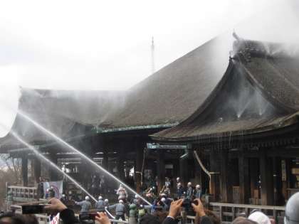 はじめに消防署の方が説明をしてくださいました。そして11時にサイレンの音と共に、本堂から煙が見え始め、宝物が運び出されました。そして、本堂の大きな屋根からも一斉に放水。水煙に包まれる様子は圧巻。消火にあたられる皆さんのすばやい動きにもびっくりしていた子どもたち。「こんなに多くの人が協力して、世界遺産の清水寺が守られているのだなあ」「昔の人から大切に受け継がれてきた宝物を、自分たちも守っていかなければ」と4年生児童の感想が聞かれました。