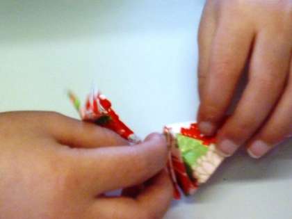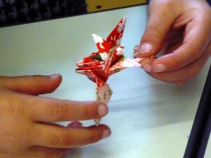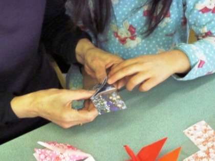親鶴は大きいので,折りやすいのですが,子どもの鶴は小さいので,折るのに苦労しました。また,二つの鶴が,口ばしのところでつながっているので,ちぎれないように慎重に折っていきました。一つ目が完成した後,二つ目に挑戦しました。二つ目は,親鶴が羽ばたく鶴の折り方を教えていただきました。