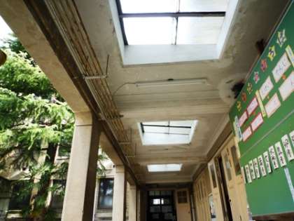 シリーズ13の6年生の教室でも紹介しましたが,本校の校舎には,外からの自然の光を上手く取り込む工夫が施された箇所があります。その一つは,校堂前の通路です。この廊下は北側に位置しているため,太陽の光が差し込みません。そこで,この通路の上には明かり取りのガラス窓がはめ込まれているのです。また,北校舎の階段の吹き抜け部分には,下から天井まで続く大きな窓があります。この窓は南に面しているので,この階段と廊下がとても明るいです。他にも,講堂も,南側と東側に大きな窓があり,中がとても明るくなるように作られています。