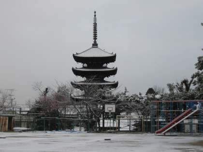 運動場も真っ白。八坂の塔の屋根にも雪が積もり、