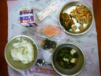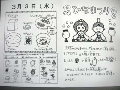 3月3日,今日は雛祭りの日。昨日までの暖かさも一休みとなり,今日は,風が強くて少し肌寒い一日でした。今日の給食献立は,「雛祭り」献立でした。主食はチラシずし,副食は平天の煮付けと菜の花のすまし汁です。チラシずしは,自分で白ごはんに具を混ぜていただきます。そして,デザートが,1年に1回,雛祭り献立のときだけ付いてくる3色ゼリーです。初めての1年生は,ニコニコ顔で「どんな味なの?」と言いながら,とても楽しみにしていました。
