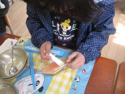 今日は3月3日,ひなまつり。給食では「三色ゼリー」と「ちらしずし」をいただいて,1年生の子どもたちも大喜びでした!
