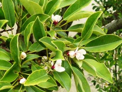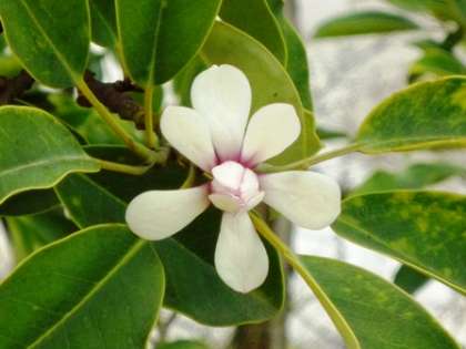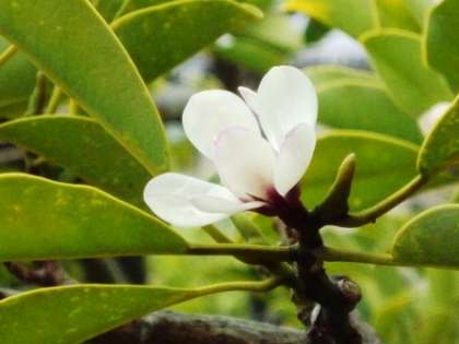 本校の校庭の中で一番目立つ木,おがたまの木。京都市立学校名木百選にも指定されている木です。この木の枝先に,可愛い白い花弁の花が咲き始めています。6片の花弁に軸の辺りは綺麗な紫色をした花が,枝先にたくさん付いています。これから咲く蕾もたくさんあり,まだしばらくは,楽しむことができそうです。この花も咲き終わって,夏頃には,またたくさんの実を付けることでしょう。