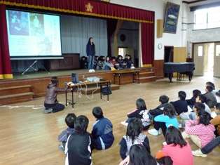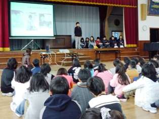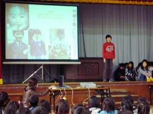 10日(水),今年度最後の清水タイムは,6年生の発表です。総合的な学習「未来に生きるわたし」で学習してきたことをまとめて,自分の将来の夢を,全校児童の前で一人一人がしっかりと語りました。家の家業を継ぎたい,学校の先生になりたい,研究家になりたい,インテリアデザイナーになりたい等々,自分の夢と,その夢に向って頑張っていく決意を語りました。