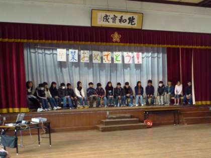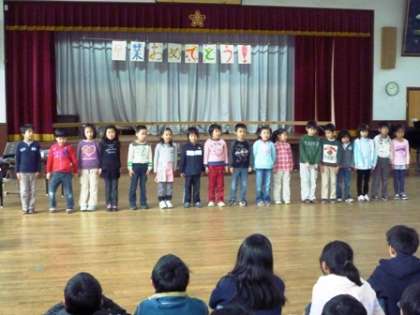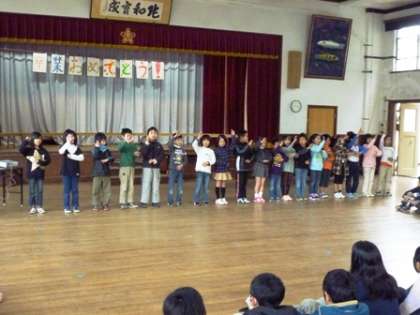 17日(水)。今日,全校児童が集まって,6年生をおくる会を行いました。今年は,19名の6年生が,この清水小学校から巣立っていきます。その6年生をみんなでお祝いする会です。初めに,各学年からのお祝い言葉や歌,合奏のプレゼントがおくられました。1年生からは,言葉と歌「ゆうきを出して」のプレゼント,2年生からも,言葉と歌「はじめの一歩」のプレゼントがおくられました。