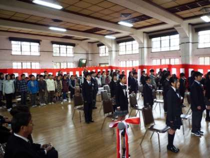 「清水小学校で学んだ力を信じ,夢と希望をもって,素晴しい未来に向かって歩んでください」「今まで支えてくださった多くの方々への感謝の気持ちを忘れないでください」など,多くのお祝いの言葉や励ましの言葉をいただき,卒業生たちは,改めて,卒業の喜びをかみ締めてくれたことと思います。続いて,PTAと自治連合会から卒業記念品をいただきました。最後に,在校生と卒業生が一緒に門出の言葉を交わしました。卒業生の力強い言葉や在校生の温かい言葉の数々,そして,素晴しい歌声に会場が包まれ,感動的な卒業式が終わりました。