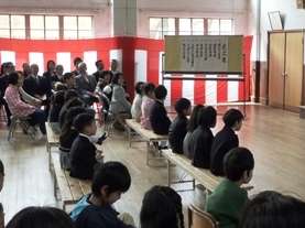 お兄さん,お姉さん,おうちの方,地域の方々が迎える中,かわいらしい1年生が元気よく入場しました。最初に,校長先生からお話がありました。お話の中で,校長先生と2つの約束をしました。1つ目は,「毎日,元気に学校へ来ましょう。元気よく挨拶して,交通事故にあわないように気をつけて登校しましょう」です。2つ目は「友達と仲よくしましょう。意地悪をしてはいけませんよ」です。その後,PTA会長さんのお祝いの言葉がありました。校長先生のお話もお祝いの言葉も,しっかりと聞くことができ,とてもかしこい1年生の子ども達でした。