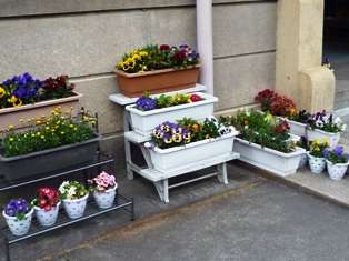 咲き誇っていた桜の花も,盛りを過ぎ,舞い散った花びらが路面を覆う季節になりました。その桜の花にとりかわり,プランターに植えられているチューリップやパンジーといった花々が,咲き誇っています。その花々が,玄関前や中庭を美しく飾っています。