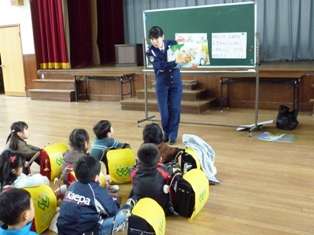 はじめに,警察官の方から,安全な道路の歩き方を教えていただきました。絵を見ながら,「その時は,止まるのだよ」「右左を見るのだよ」「歩道を歩くのだよ」など,尋ねられたことにきちんと答えられ,交通ルールをしっかり覚えている子ども達でした。