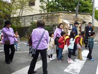 そして,実際の下校のコースに分かれて,交対協の方々に見守られながら,家まで帰りました。「ここは,気をつけないといけないよ」「ここでは,どうしたらいいのかな?」と,実際の登下校の道を歩きながら,安全のために必要なことを教えていただきました。