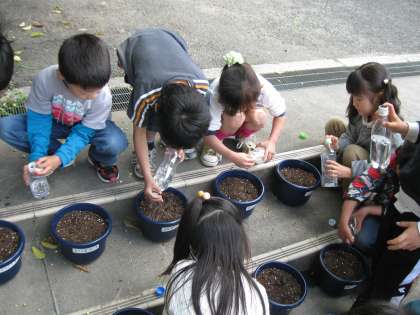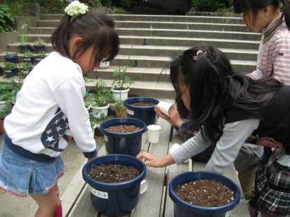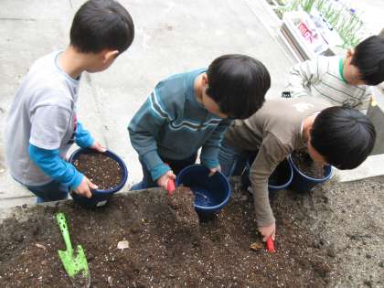 「さあ、土を入れなくちゃ。ふわふわの土だね。」