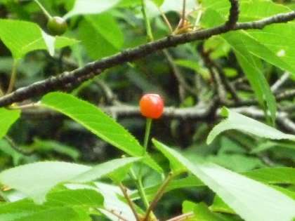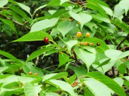春には満開に咲き誇っていた桜の木。今では,青々とした葉がおい茂っています。その葉と葉の間をよく見ると,小さな小さな可愛いサクランボができています。まだ青い実もあれば赤く熟した実も見られます。この実を,メジロやシジュウカラ,ヒヨドリなど小鳥たちがついばみにやってきています。