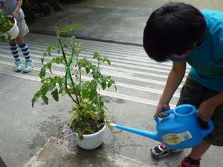6月1日(火)。2年生では,生活科の学習で,ミニトマトやトウモロコシ,サツマイモを育てています。4月の終わり頃に植えたミニトマトの苗も,大きくなり花も咲き,青い実ができてきています。今日も,5時間目にみんなで観察をしました。「トマトと同じ匂いがする」「(表面が)ツルツるしている」などと言いながら,ノートに観察した結果を書いていました。観察したついでに,水やりをする子どももいました。早くトマトができてくれるといいな。