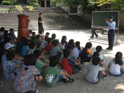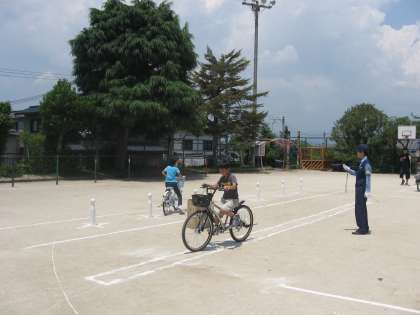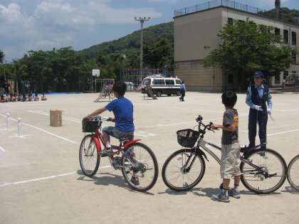 清水小学校では,今日,夏本番を思わせるようなお天気の下,運動場で自転車安全教室を行いました。東山警察署の方から,交通ルールについてのお話を聞いた後,設定されたコースを実際に自転車で走ってみました。
