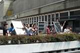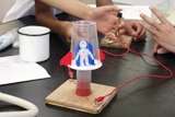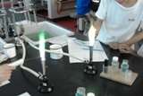 途中の休み時間には,外に出て,鏡を使って太陽の光を太陽電池に当てる道具で遊びました。後半の学習では,銅やリチウムを燃やして炎色反応を調べる学習や,アルコールを爆発させてミニロケットを飛ばす実験をしました。炎色反応を調べる実験では,緑色や青色,赤色に燃える炎がとてもきれいでした。ミニロケットは,教室の天井まで飛び上がり,夢中になってロケットを飛ばしました。