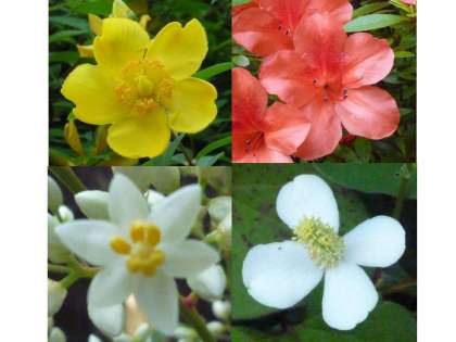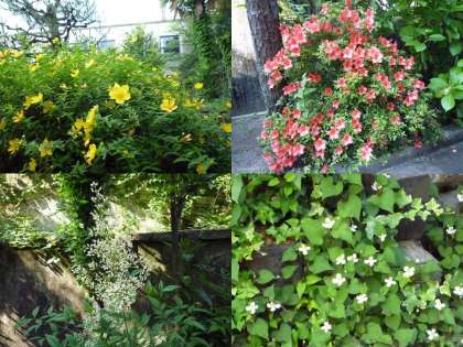 写真左…全体の様子(金糸梅,サツキ,ナンテン,ドクダミ)