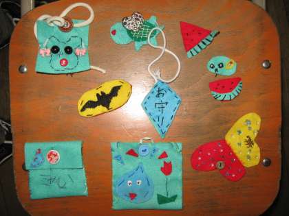 スイカやちょうちょのかわいいマスコットや,お守り,小物入れ。かわいくて,子どもらしい楽しい作品が,たくさんできました!