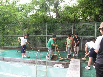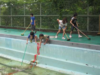 今日は,あいにく「雨」の予報で,予定されていたプールそうじは時間を繰り上げて1時間目から行いました。4年生はプールサイドの落ち葉や泥を取り除く役割でした。だんだんきれいになってくると,「プールの中に早く入りたい〜!」という子もちらほら・・・。でも,今日はガマンガマン!6月下旬からの水泳学習が楽しみですね!
