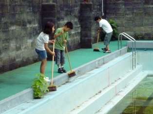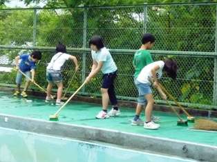 15日(火)。もうすぐ,みんなが大好きなプール学習が始まります。今日は,みんなでプールをお掃除しました。低学年は,更衣室や足洗い場の周辺を,中学年は,腰洗い場や洗面場とプールサイドを掃除しました。1年間使っていないプールなので,落ち葉や砂ぼこりなどのゴミがたまっています。それをほうきやブラシを使って綺麗にしました。プールの中は,高学年の子ども達が掃除する予定でしたが,雨が降ってきたので,延期しました。来週から始まるプール学習が,とても楽しみです。